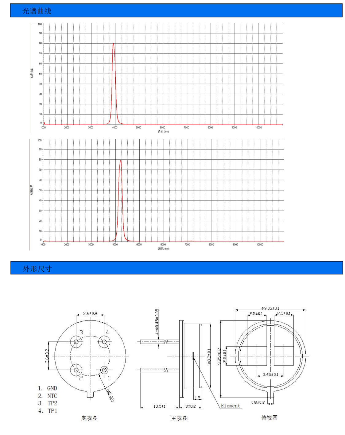 參數 Min. Typ. Max. units 測試條件 尺寸 1.1×1.1 mm2 靈敏區域 0.35×0.35 mm2 熱電堆電阻 80 98 115 KΩ Temp=25℃ 噪聲電壓 36±2 nV/Hz1/2 Temp=25℃ 噪聲等效功率 0.23 nW/Hz1/2 Blackbody=500k,1Hz@25℃ 響應度 134 164 194 V/w Blackbody=500k,1Hz@25℃ 電阻溫度系數 0.06 %/℃ Temp=25℃~75℃ 時間常數 ≦13 ms 探測率 1.51E+08 cmHz1/2/w Blackbody=500k,1Hz@25℃ NTC阻值 100±3% KΩ 25℃ NTC β 3950±1% K 25/50℃